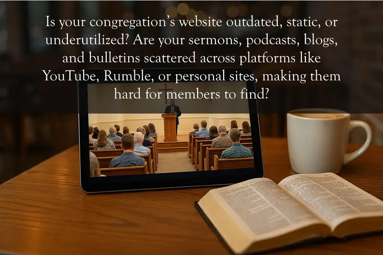 Is your congregation’s website outdated, static, or underutilized? Are your sermons, podcasts, blogs, and bulletins scattered across platforms like YouTube, Rumble, or personal sites, making them hard for members to find?